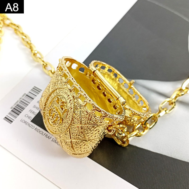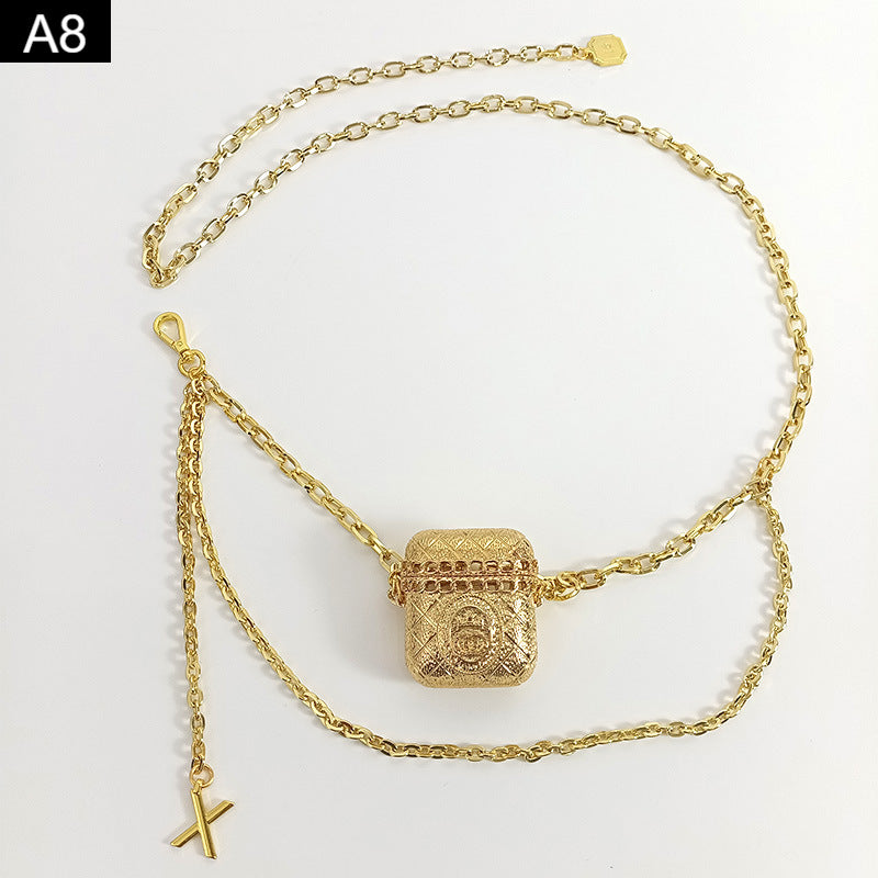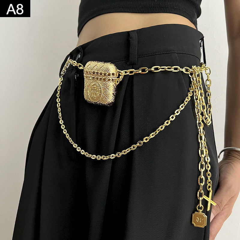 A statement making gold chain waist belt that instantly elevates any look. This accessory features a textured, ornate mini case perfect for airpods and a cascading layered chain with a bold logo charm, blending high-fashion style with street smart utility.