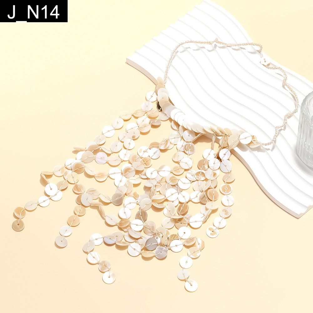 Ariel Cascade Necklace: A breathtaking statement piece inspired by the beauty of the sea. This elegant collar is handcrafted from dozens of small, polished Mother of Pearl discs that shimmer with a natural iridescence. The discs are meticulously strung together to create a flowing, fringed design that moves beautifully with you, mimicking a waterfall of moonlight. It's the perfect accessory to add a touch of ethereal luxury and organic texture to resort wear, evening gowns, or simple summer tops.