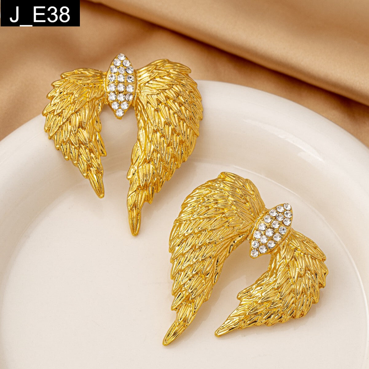 The Celestial Feather Studs: Intricate detail meets dramatic glamour. These bold, oversized stud earrings are a testament to exquisite craftsmanship. Each wing is sculpted with a lifelike, textured feather pattern in a high-shine gold-tone finish, giving them a rich, layered look. The wings are secured by a central, marquise-shaped cluster of brilliant pavé crystals, providing a focal point of dramatic sparkle. They're a luxurious statement piece designed for those who appreciate both intricate detail and bold scale.