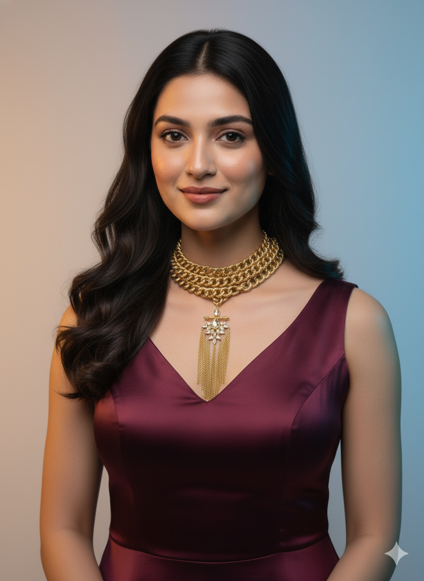 The Crusader Choker: Command attention with this magnificent, maximalist statement piece. The necklace features a bold, multi-strand choker of chunky curb chains coiled tightly for a rich, sculptural effect. Dangling from the center is an elaborate, cross-inspired pendant crowned with brilliant crystals, leading into a dramatic cascading tassel of fine gold chains. This opulent piece is the ultimate accessory for injecting baroque glamour and undeniable power into any evening or high-fashion look. Boldness, defined by gold.