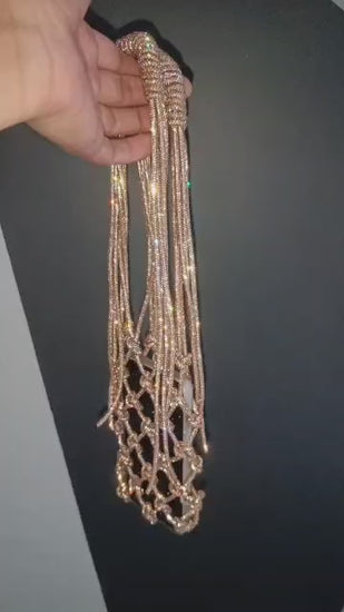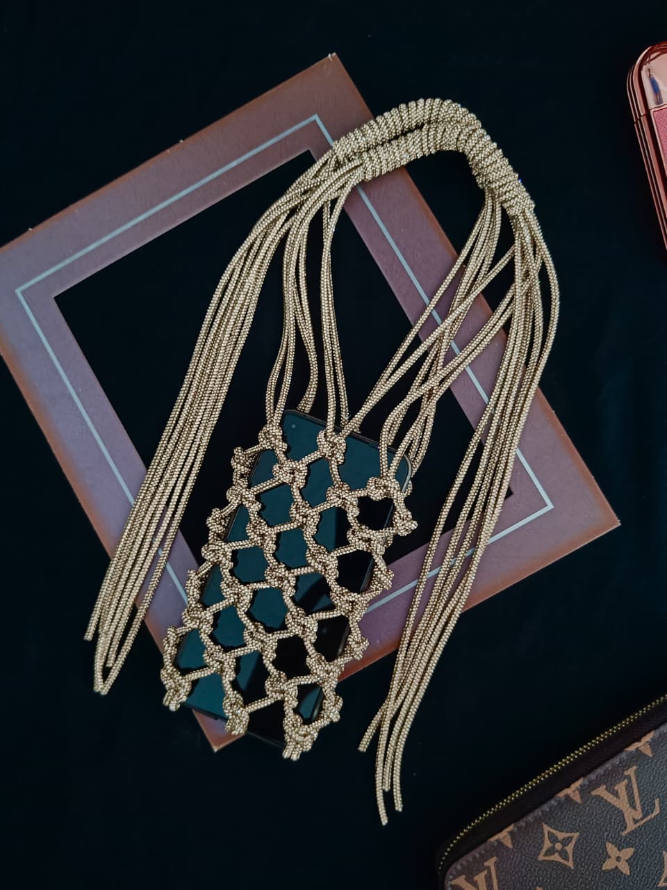 Discover elevated style with the Silver Luxe Handwoven Mobile Pouch — a stunning blend of fashion and functionality. Crafted with a premium hand-knotted metallic mesh, this pouch offers a couture look that instantly upgrades any outfit. The intricate diamond-weave detailing and cascading chain fringes give it a luxurious, runway-inspired feel.