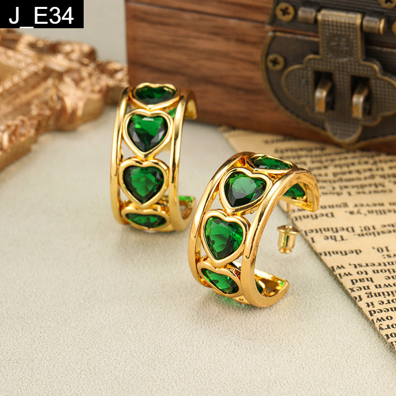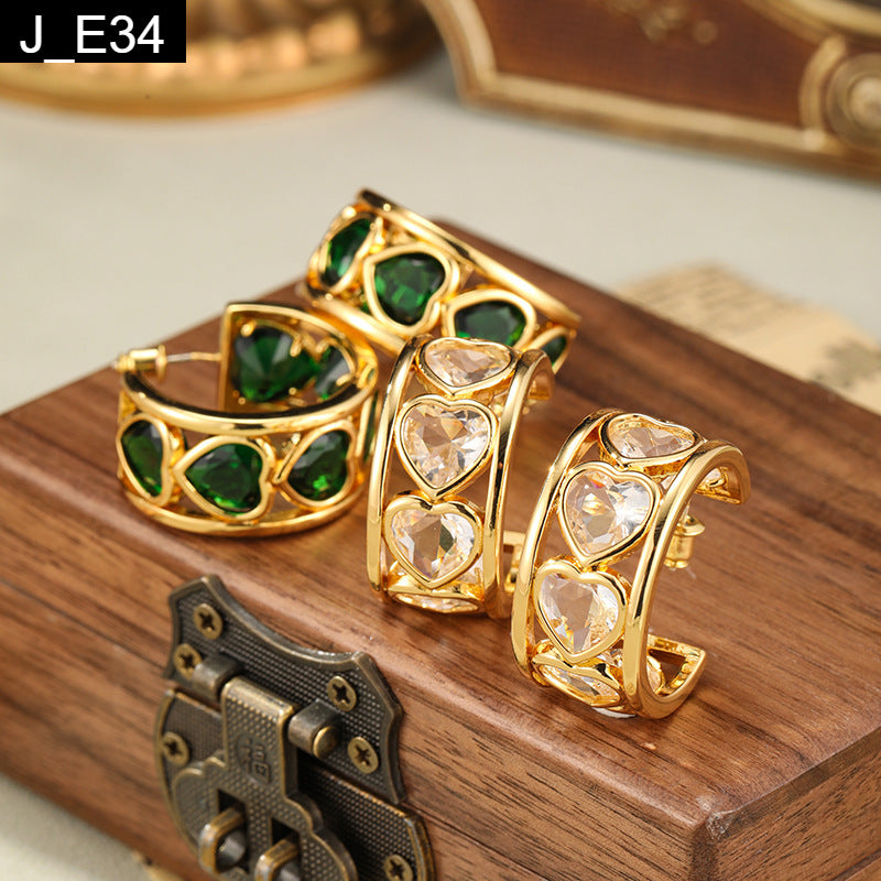 The Cupid's Arc Hoops: Bold romance in every brilliant facet. These stunning half-hoop earrings make a chic statement with their chunky, gold-toned silhouette. They are beautifully set with a series of brilliant, faceted heart-shaped crystals, creating an elegant, open-back setting that lets the light shine through. Available with either classic clear crystals or vibrant emerald green crystals, these earrings are a perfect accessory for adding a touch of bold, luxurious love to your look.