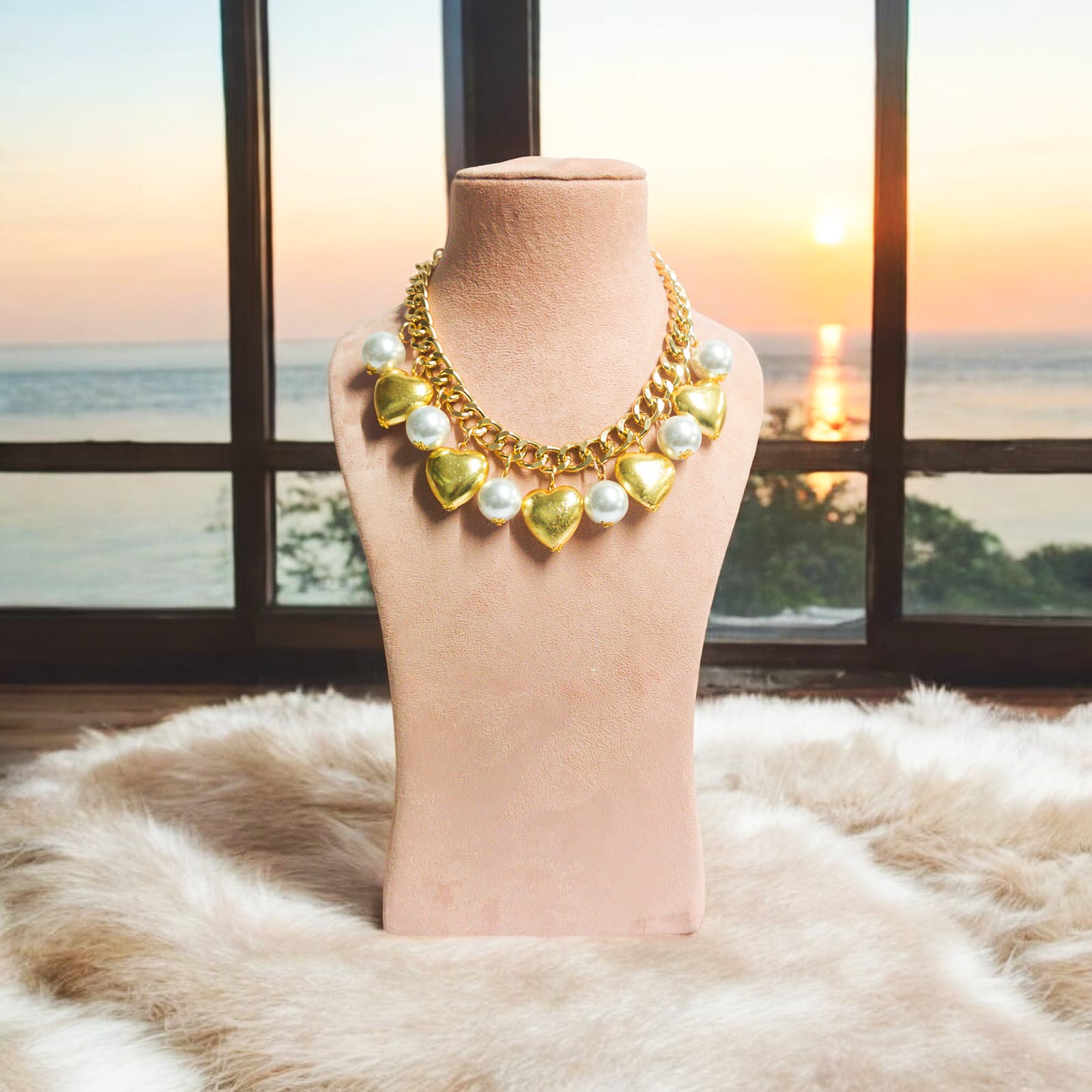 Duchess Desire Necklace: A magnificent statement necklace that defines bold, romantic luxury. This piece features a chunky, highly polished gold-tone curb chain that serves as the foundation for a spectacular bib design. The garland is composed of alternating, oversized puffed gold hearts and luminous faux pearls, creating a dramatic, textured cascade around the neckline. This choker is the perfect accessory for making a high-impact impression, instantly elevating any outfit with its opulent texture and confident, luxurious style. Wear your heart, covered in gold.