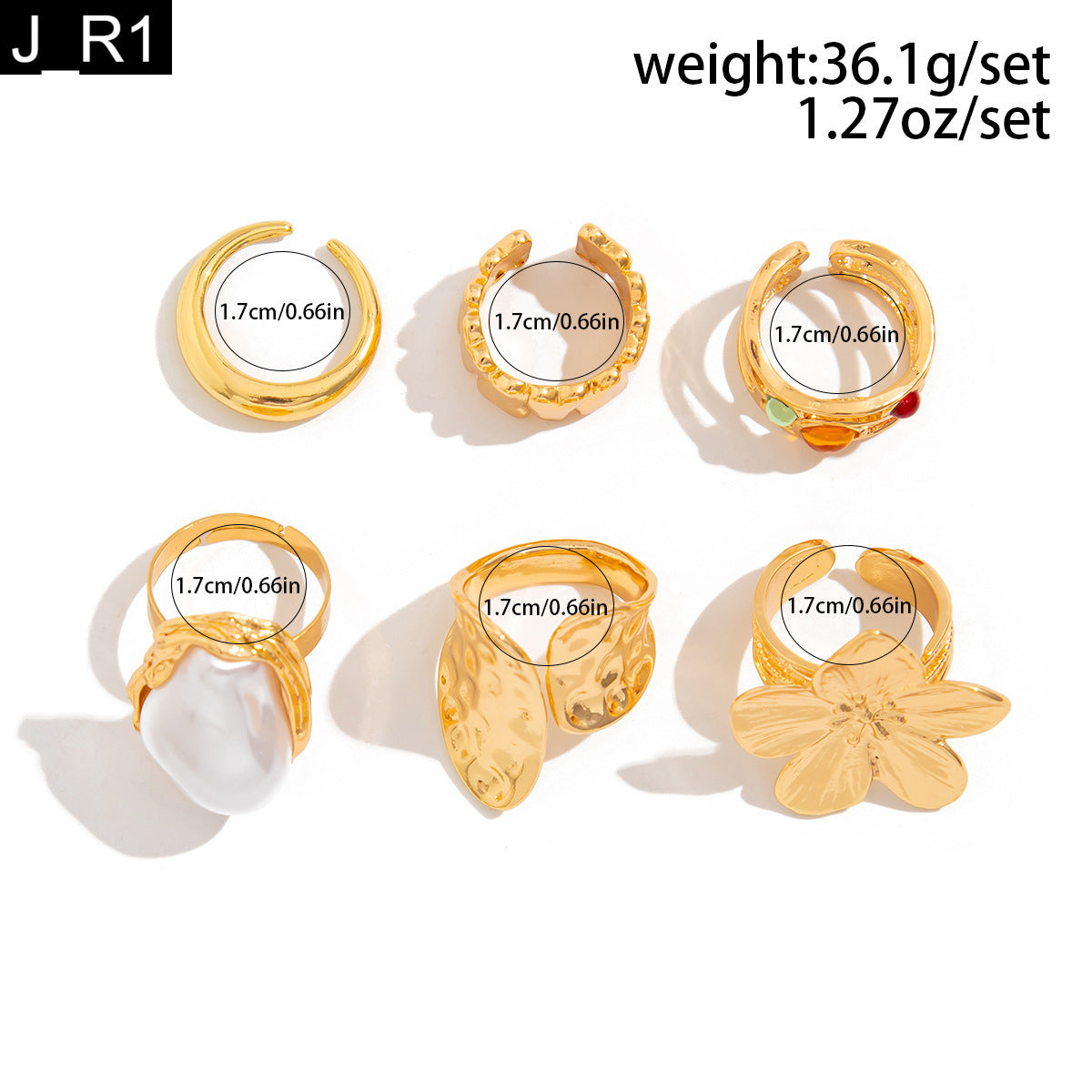 This is a set of five gold-toned rings with a mix of bold, sculptural designs. The collection features a large, pearl-like center stone, a delicate floral shape, and an eye-catching ring with a few small, colorful gemstones. The other two rings have unique, organic textures and shapes.
