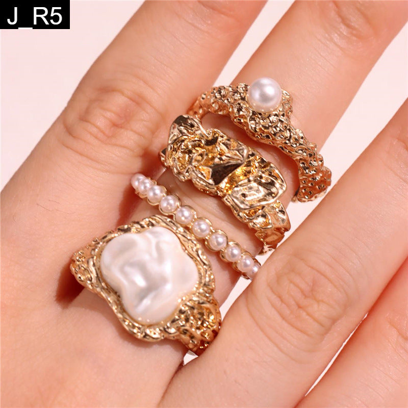 The Gilded Tide Rings: A modern treasure inspired by the sea. This artful set of four stackable rings features a brilliant gold-tone finish and a variety of textures for a luxurious, layered look. The set includes a sculptural band with a single round pearl, a sleek band of miniature pearls, a statement ring with a raw, molten metal texture, and a bold ring crowned with a large, irregularly shaped baroque pearl. Wear them together for maximum impact or individually for a touch of bohemian-luxe style.