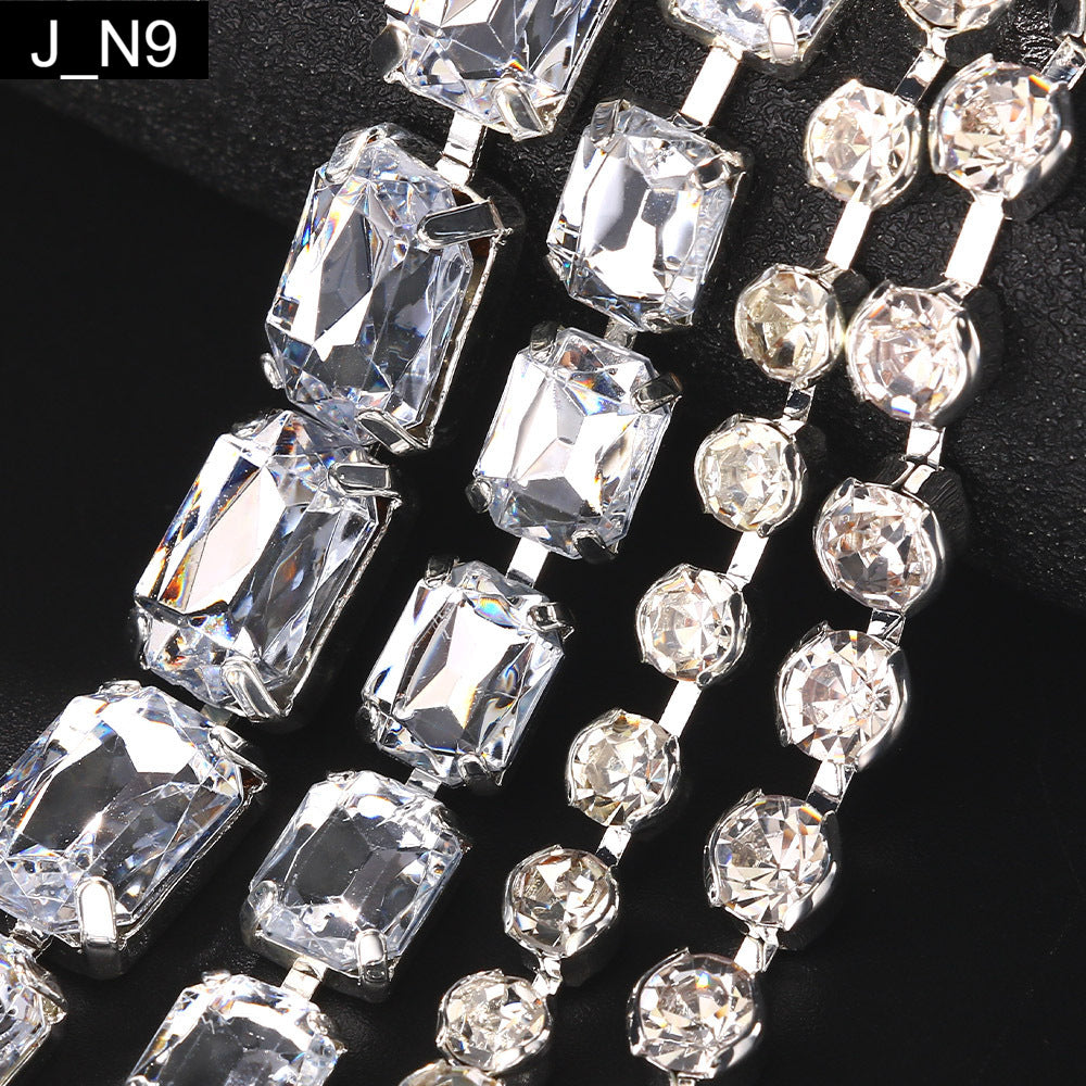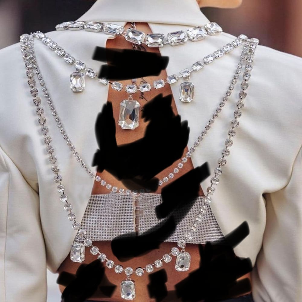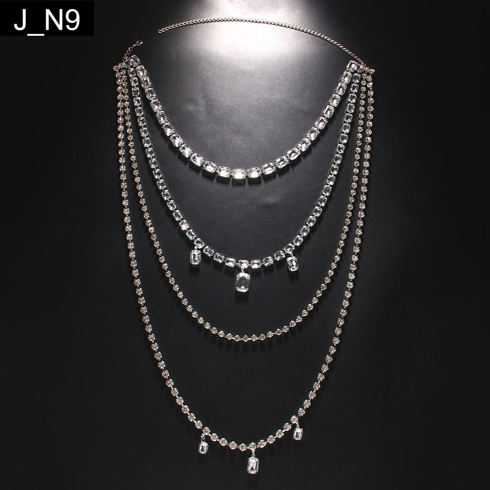The Glacial Grandeur Cascade: Radiant layers of pure shimmer and shine. This breathtaking statement necklace features a lavish arrangement of four cascading strands that graduate in length and sparkle. The top layer showcases a row of brilliant, square-cut crystals, followed by three additional layers alternating between delicate rhinestone chains and strands adorned with dazzling teardrop and rectangular crystal drops. Designed to command attention, this piece creates an illusion of opulent depth and movement, making it the perfect show-stopper for any formal event.