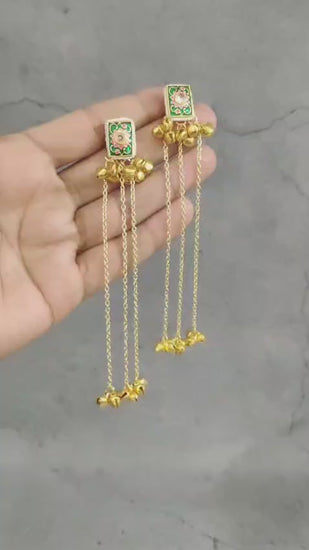Elevate your ethnic and festive looks with these gold plated long chain earrings, designed with a classic green stone accent and delicate cascading chains that add graceful movement and charm.