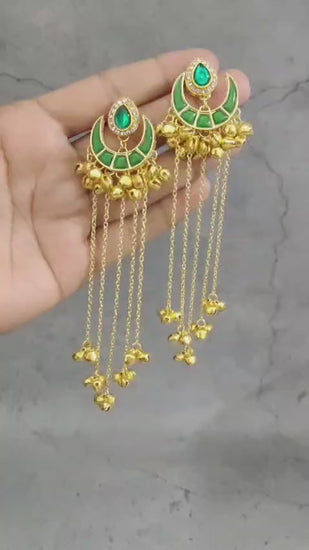 Add timeless elegance to your ethnic wardrobe with these gold plated kundan long chain earrings, beautifully accented with rich green enamel detailing. Designed to make a statement, the cascading chains create graceful movement that instantly elevates any festive or party look.