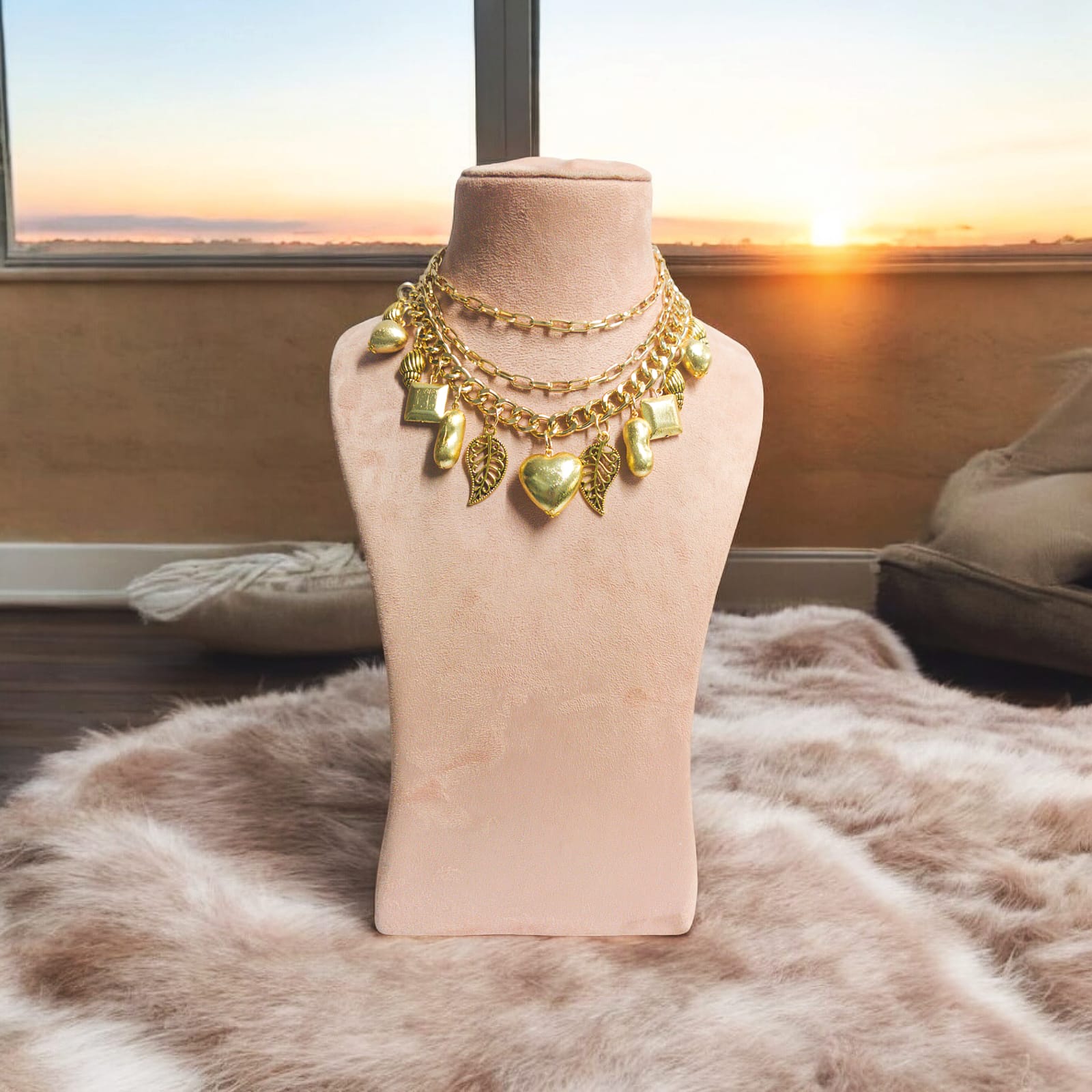 Golden Keepsake Necklace: A magnificent, pre-layered necklace that feels like a treasured collection. This essential piece features three distinct gold-tone chains of varying lengths, perfectly draped for instant volume. The chains are adorned with a continuous fringe of chunky, sculpted charms, including puffed hearts, geometric shapes, and stylized leaves, all finished in a rich, antique gold tone. This necklace is the ideal way to add opulent texture and confident, bohemian glamour to any outfit. Start your collection, complete your look.