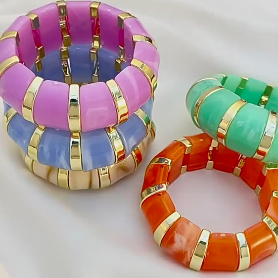 Miami Candy Bangle: Inject instant fun and retro flair into any outfit with this bold wristwear. These chunky bangles feature a unique bamboo-style link construction crafted from smooth, high-gloss marbled resin. Each segment is accented with a delicate gold-plated band, creating a striking contrast against the vibrant, playful colors like aqua, electric orange, and lavender. Designed to be stacked or worn individually, these bangles are the perfect accessory to brighten up your day and channel a chic, sun-kissed style. Get your daily dose of color.