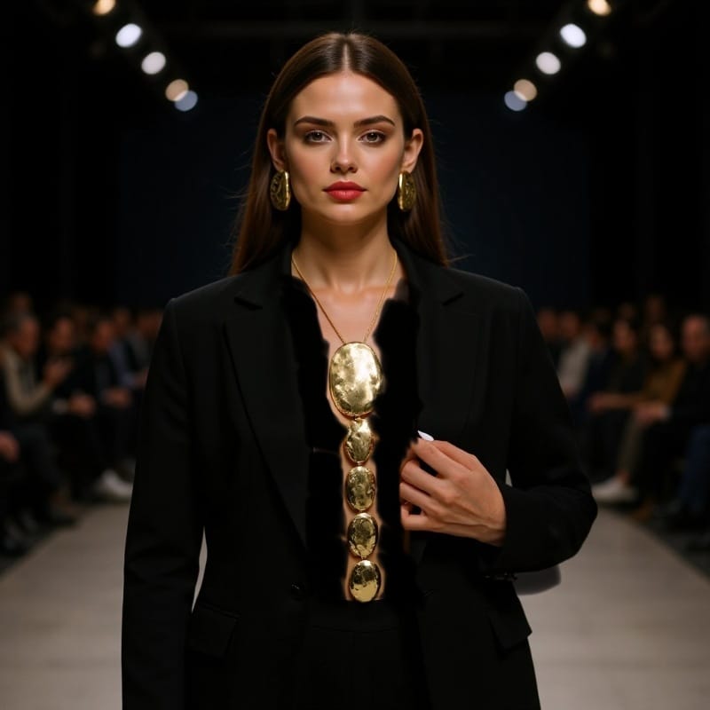 The Molten River Lariat: A striking statement in abstract elegance. This bold, contemporary necklace features a sequence of five oversized, organic-shaped pendants, each finished with a unique, hand-hammered texture that catches and reflects light beautifully. The pendants cascade downwards from a large top piece, creating a stunning, elongated silhouette. Available in both high-shine gold-tone and polished silver-tone, this piece is the ultimate accessory for adding sculptural drama and high-fashion flair to a simple neckline.