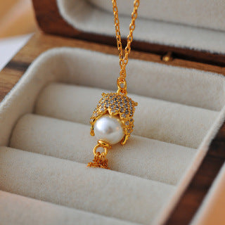 This is an elegant and whimsical jewelry set featuring an owl motif, available as both stud earrings and a pendant necklace. Each piece showcases a stylized owl with a central, luminous pearl serving as its body. The owl's head and wings are crafted from a gold-toned metal and are intricately embellished with sparkling cubic zirconia, with two black stones for eyes. The matching necklace features a smaller version of the owl charm, dangling from a delicate gold-toned chain. This set is a charming and sophisticated choice, symbolizing wisdom and adding a touch of playful sparkle.