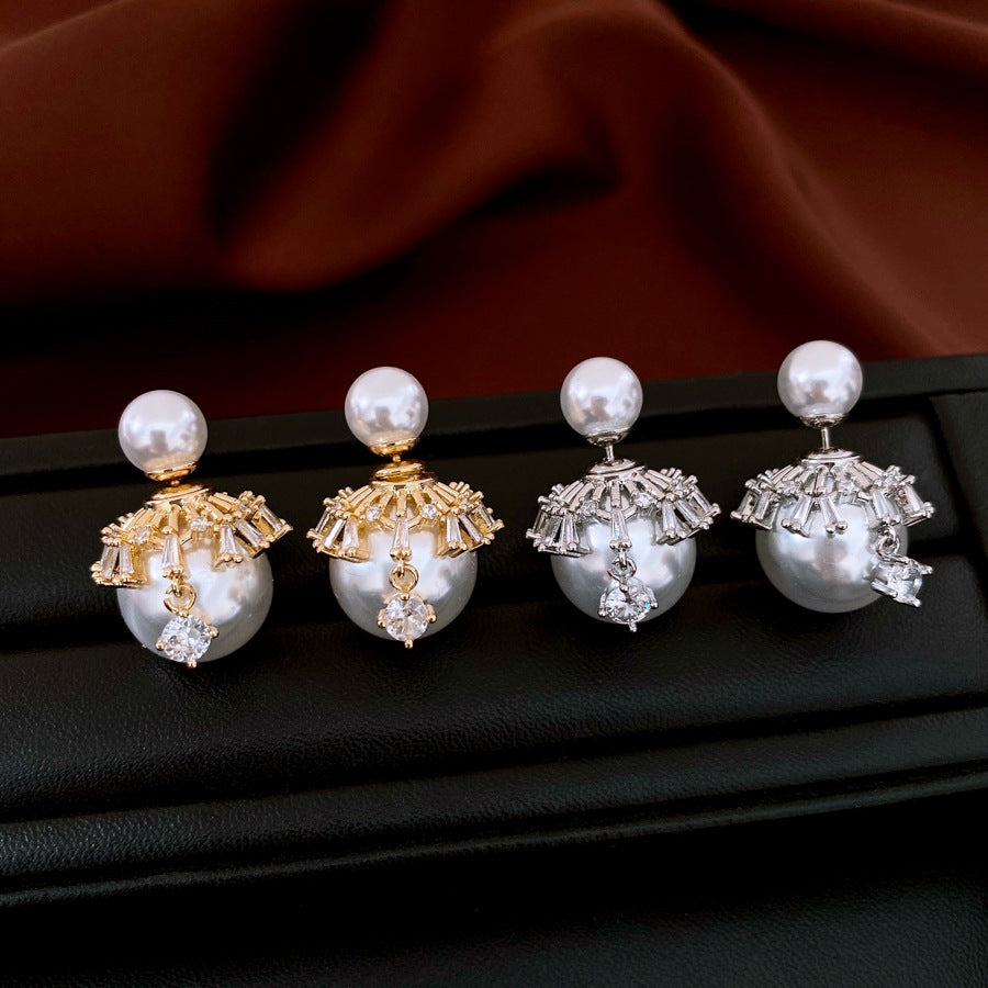 These are a pair of elegant and sophisticated double-sided stud earrings. They feature a smaller, classic pearl that sits on the front of the earlobe. From the post, a larger, luminous pearl dangles, partially crowned by a starburst-like arrangement of sparkling cubic zirconia. The design is available in both silver and gold tones, offering a modern and luxurious twist on traditional pearl earrings that is perfect for a special occasion.
