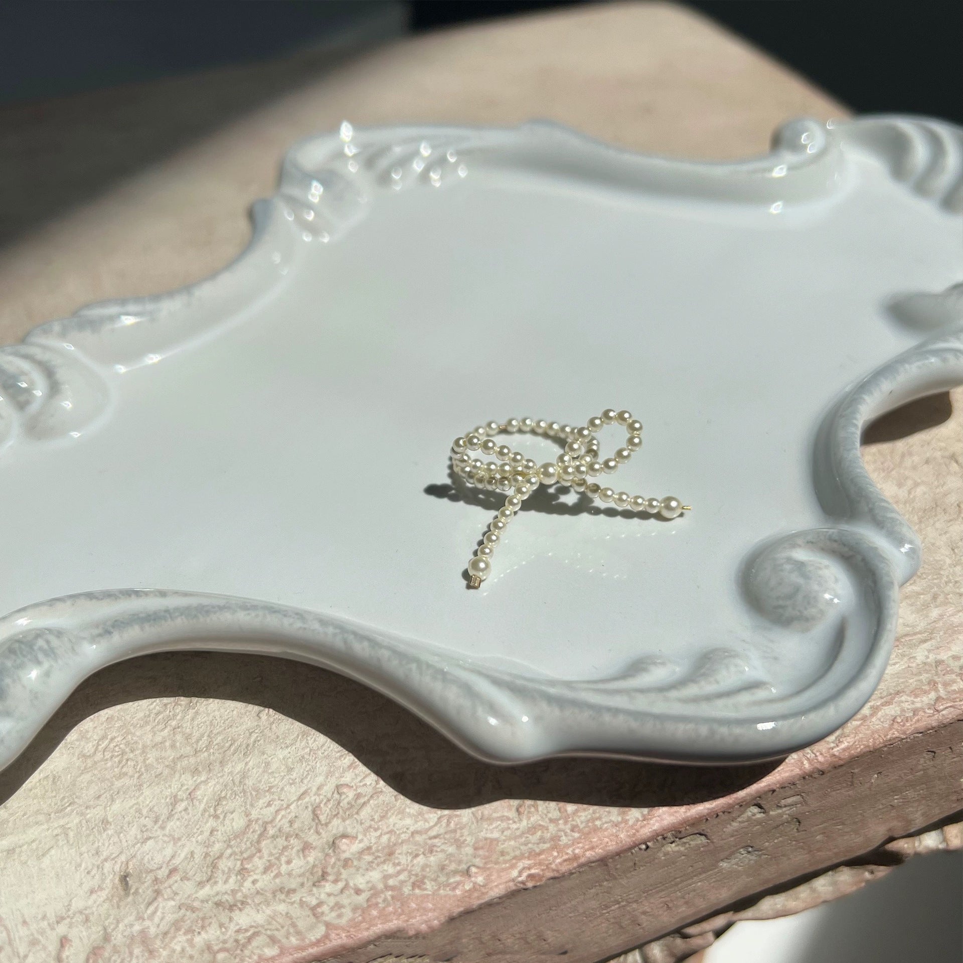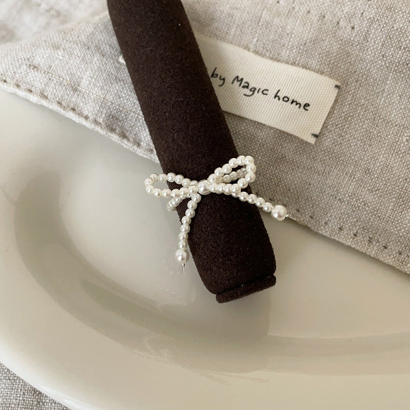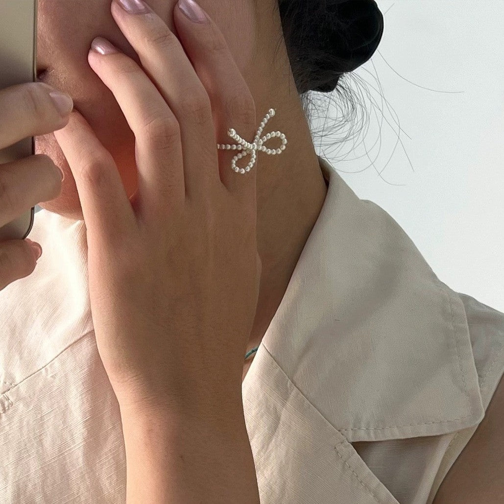 This unique and elegant ring features an open, criss-cross design, meticulously crafted from shimmering miniature beads that form an intricate, almost knotted, pattern. Its delicate yet striking appearance makes it a modern statement piece with a textural appeal.