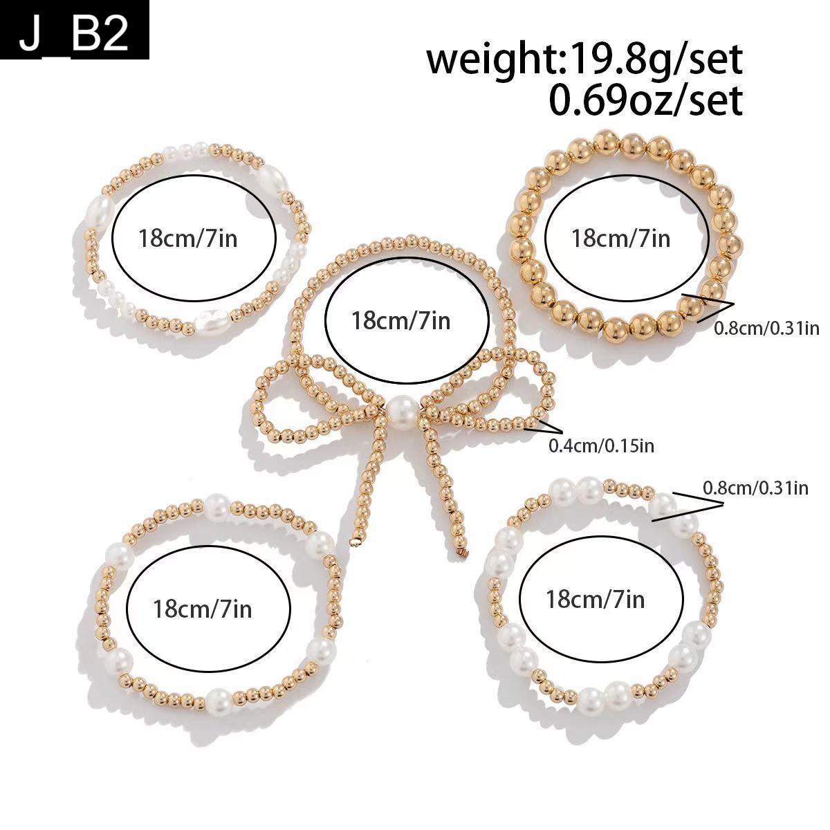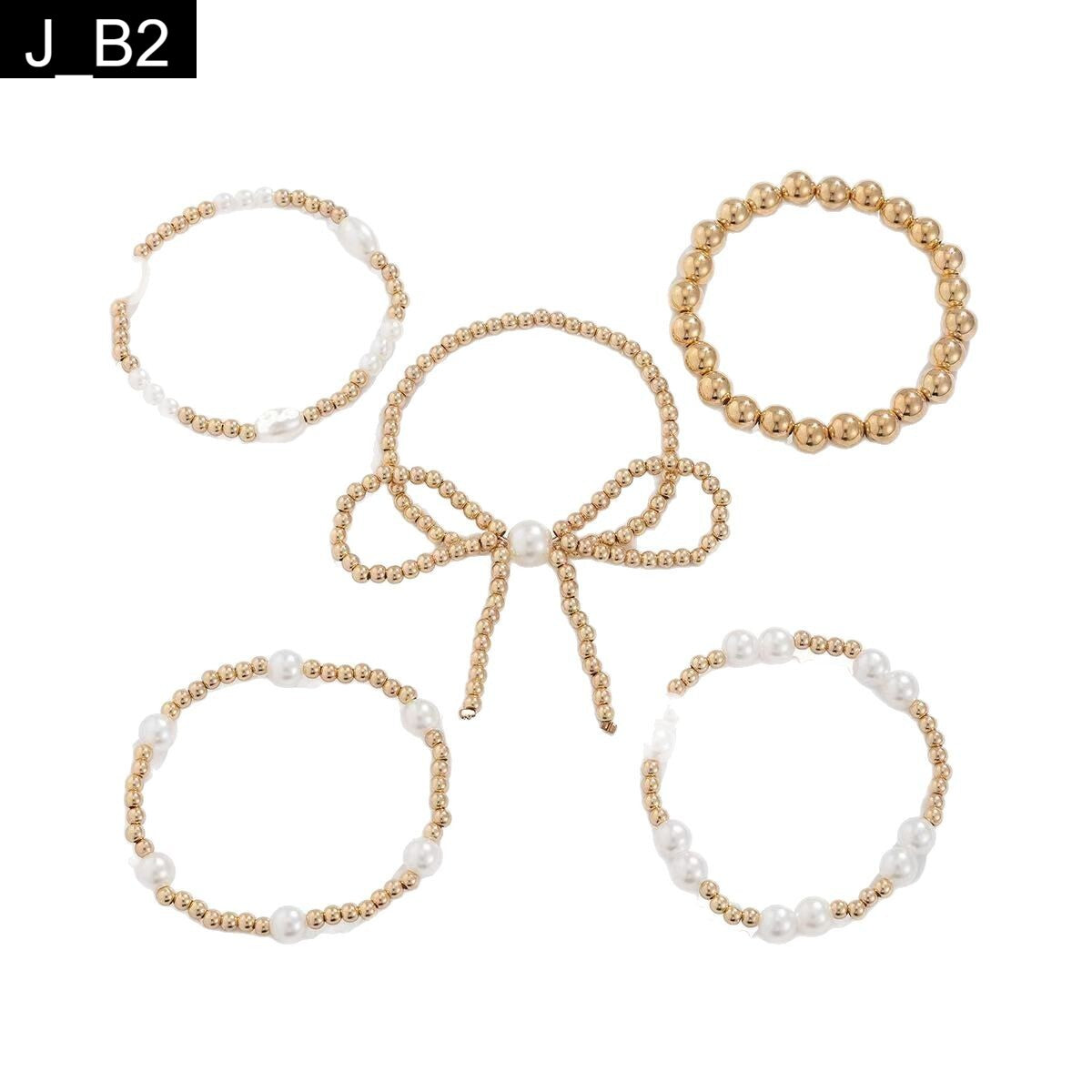 This multi-strand bracelet features a mix of gold-toned beaded chains and a delicate strand of iridescent pearls. The various strands are wrapped together, creating a layered effect that combines a classic pearl look with a modern, textural twist. The bracelet is tied with a gold-toned beaded bow, adding a charming and unique detail.