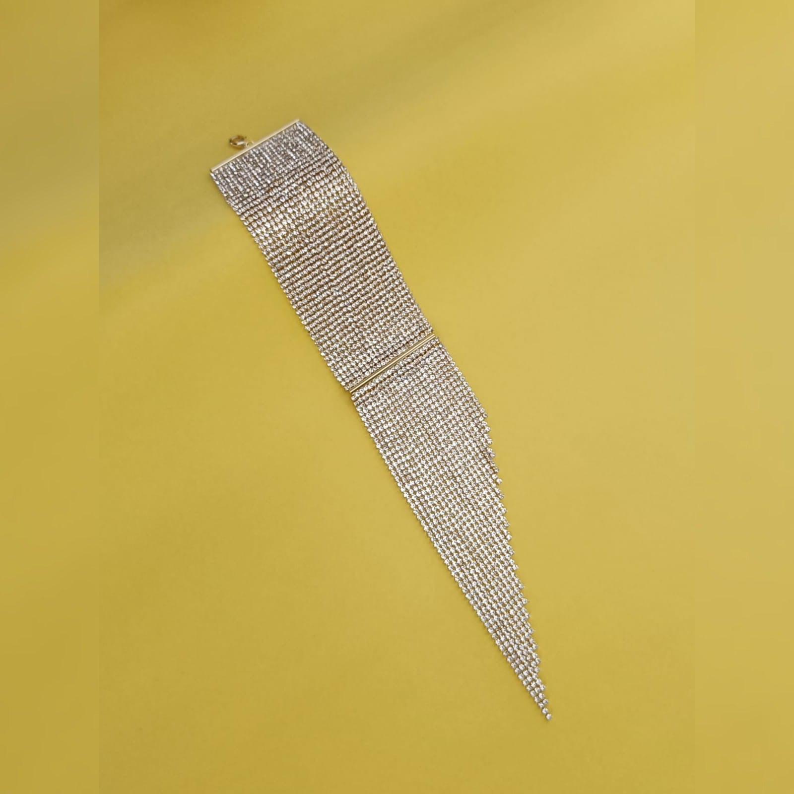 Plume Bracelet: An awe-inspiring statement bracelet designed for maximum glamour. This unique piece features a wide band of dense, close-set rhinestones that wrap comfortably around the wrist. The true drama lies in the cascading V-shaped fringe, which tapers to a long, sharp point, creating a mesmerizing, waterfall effect of pure light that descends down the décolletage. Perfect for parties and night events, this bracelet delivers an unparalleled level of sparkle and red-carpet sophistication. Leave a trail of starlight.