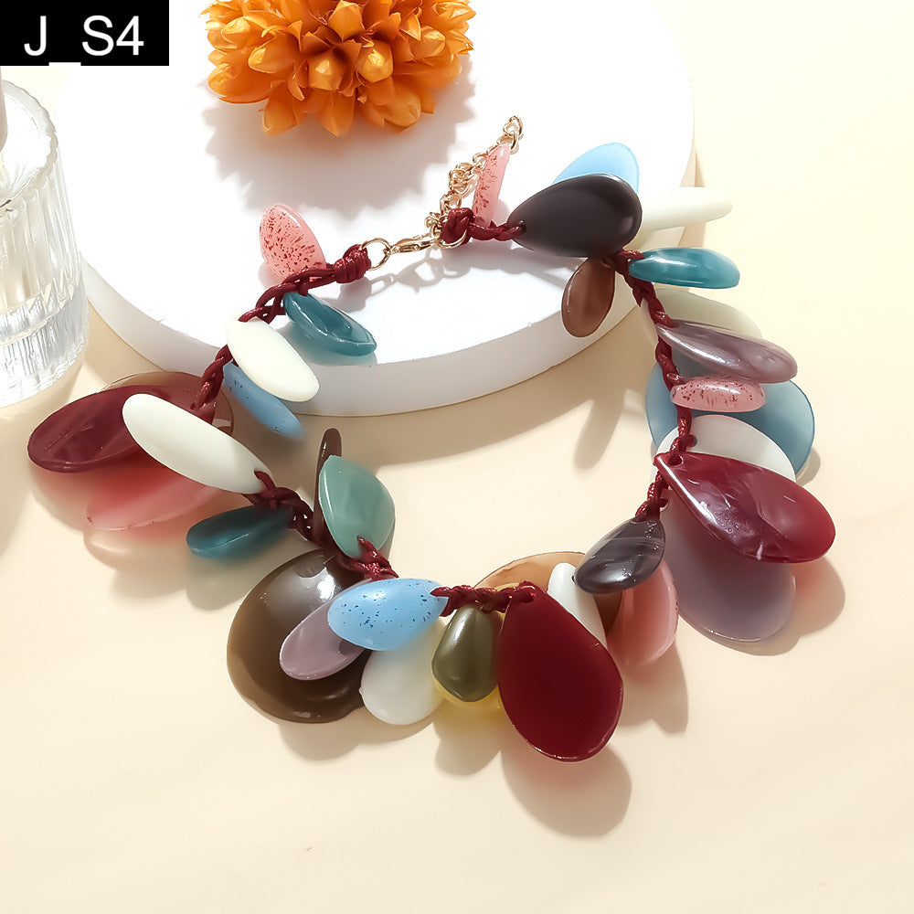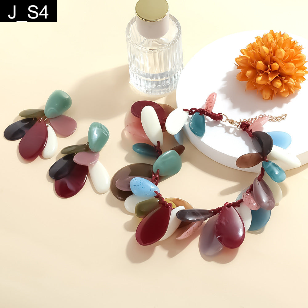 Raindrop Mosaic Set: A playful yet sophisticated jewelry collection that brings an artistic flair to any look. This matching necklace and earring set is crafted from smooth, polished acrylic drops in a beautiful, muted palette of earth tones—including deep berry, seafoam teal, creamy white, and slate grey. Each piece features a flowing cluster of these varied shapes, designed to mimic a vibrant splash of color. They're lightweight, comfortable for all-day wear, and serve as the perfect statement accessory for both casual outfits and creative evening wear.