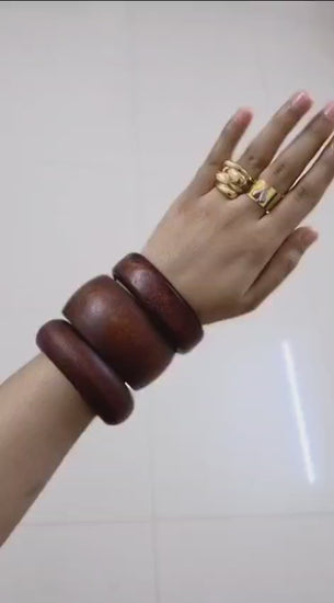 Safari Earth Wooden Stack: A set of chic, essential bangles that celebrate natural warmth and sculptural form. This collection features three oversized bracelets crafted from smooth, polished wood or resin in a rich, deep mahogany hue. The seamless, rounded shape of the bangles creates a beautiful, ergonomic curve on the wrist, delivering confident volume and earthy texture. Designed to be stacked together, these cuffs are the perfect accessory for grounding any look with a touch of sophisticated, natural elegance.