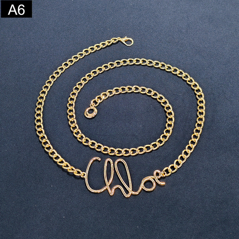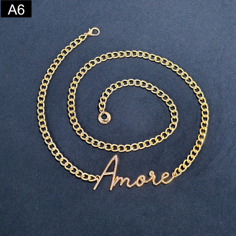 A stunning accessory that transforms any outfit with a touch of personalized, high-fashion glamour. This bold waist chain features a smooth, continuous gold-tone chain anchored by a prominent, oversized script centerpiece. The three-dimensional lettering is crafted from polished wire, giving it a sculptural, handwritten look. Perfect for cinching dresses, accenting high-waisted skirts, or adding an audacious finish to jeans, this piece delivers confident style and a customizable, luxurious touch.