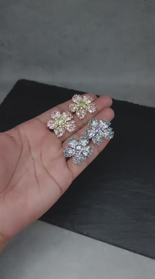 A magnificent pair of floral-shaped stud earrings, designed to make a vibrant statement. Each earring features five distinct petals, meticulously adorned with a charming array of gemstones, interspersed with smaller, clear sparkling stones for added brilliance. A prominent oval-shaped gemstone takes center stage in each flower.