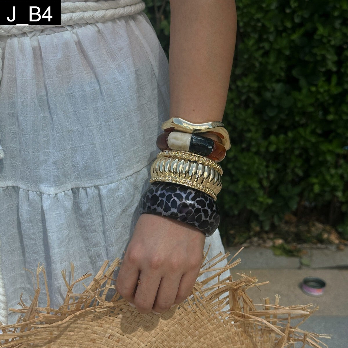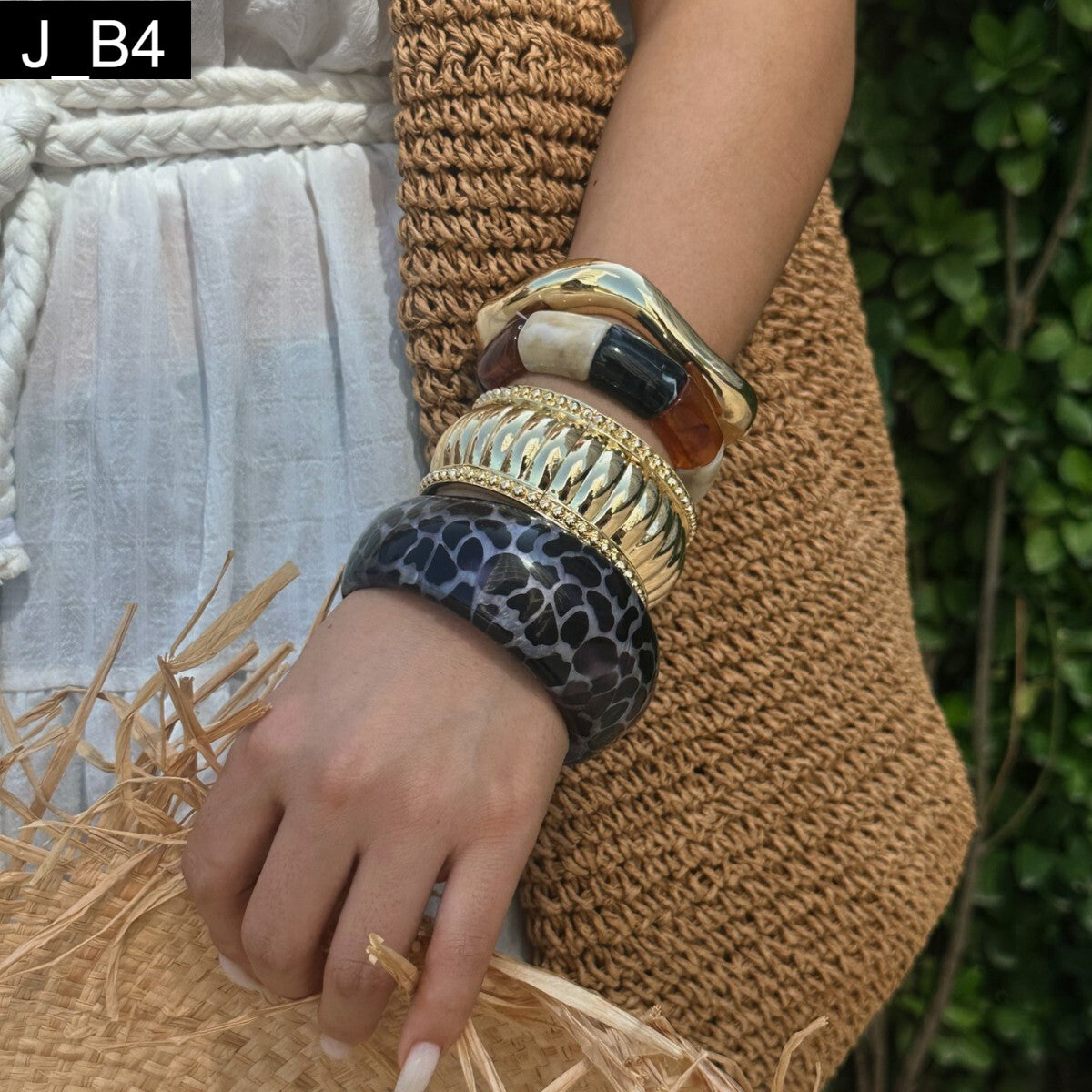 The Urban Jungle Stack: Bold contrasts, effortless statement. This collection of bracelets is designed for maximum impact, expertly mixing natural textures with polished metals. The stack includes four distinctive pieces: a wide, glossy marbled or animal-print bangle, a chunky ridged gold-tone bangle (often wrapped with a delicate chain), a layered piece featuring smooth, organic resin blocks in amber and cream, and a final wavy, liquid-gold cuff that secures the stack. Wear them all together for a luxurious, eclectic look, or mix and match for daily versatility.