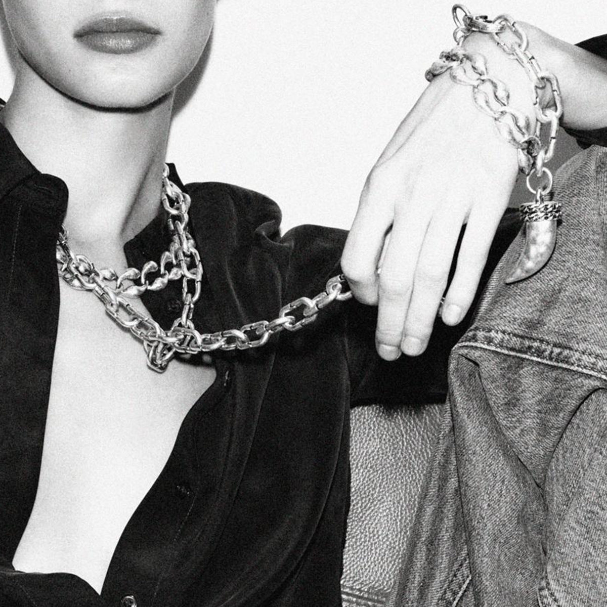 Urban Talisman Set: Define your edge with this powerful, industrial-chic jewelry collection. This coordinating necklace and bracelet set features bold, oversized curb chain links with a rich, antique silver-tone finish. The necklace sits chunky around the collarbone, while the bracelet is accented with a striking horn or tusk pendant, which serves as a protective charm. This heavy-duty set is the essential accessory for those who favor maximalist style and a touch of rebellious glamour. Boldness crafted in metal.